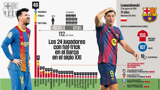 21世纪戴帽的巴萨球员:梅西48次断档领先,莱万4次跻身前五