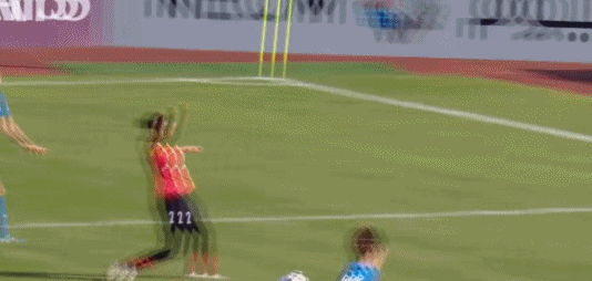第13分钟,金惠莉直塞,王霜突入禁区之后被出击的门将撞倒,主裁判回看慢镜头判罚点球,王霜右脚低射破门,2比0!