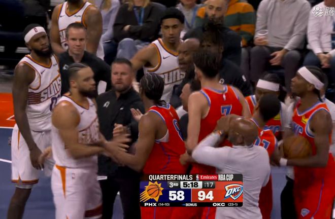 第3节比赛,雷霆队的疯狂进攻还在继续,上来半节的时间,他们又拿了20分并且打了一波20:10,比赛进行到第3节还有5分18秒,两节半的雷霆拿了94分,并且把双方分差扩大到了36分。结果此时太阳队受不了了,觉得你简直就是在羞辱我,场上的动作越来越大,直接发生了激烈冲突,双方开始打架,球打不过,就只能打架。