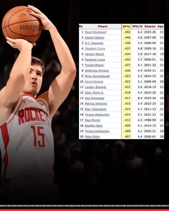 NBA历史21岁及以下三分命中率榜单中,谢泼德以45.5%位居第一,库里43.7%位居第二,杜兰特以42.2%位居第三。